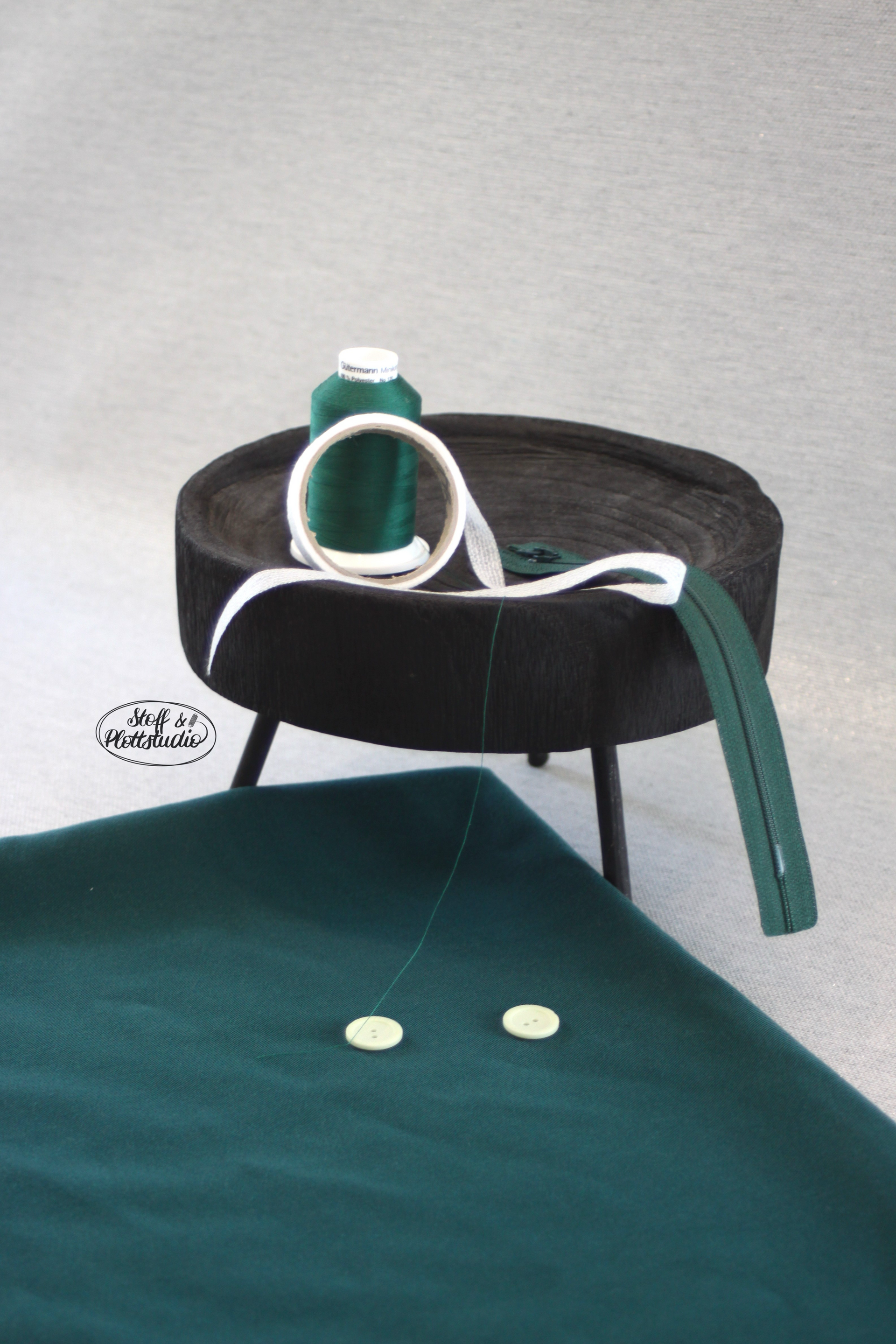 Bei der Einheit 22 wird es etwas eleganter. Denn in dieser Einheit entsteht die Hose Waterloo. Dabei wird gezeigt, wie man den Reißverschluss einnäht sowie wie eine Bügelfalte in die Hose eingearbeitet wird. Für den Schnitt ist ein Stoff mit Elasthan vorgesehen. Ich habe mich daher für einen Stretch Twill in einem schönen dunklen Grün entschieden. Den Reißverschluss sowie das Garn habe ich in der passenden Farbe gewählt. Die Knöpfe sind in einem ganz zarten Grün gehalten und bilden damit einen wunderschönen Kontrast.