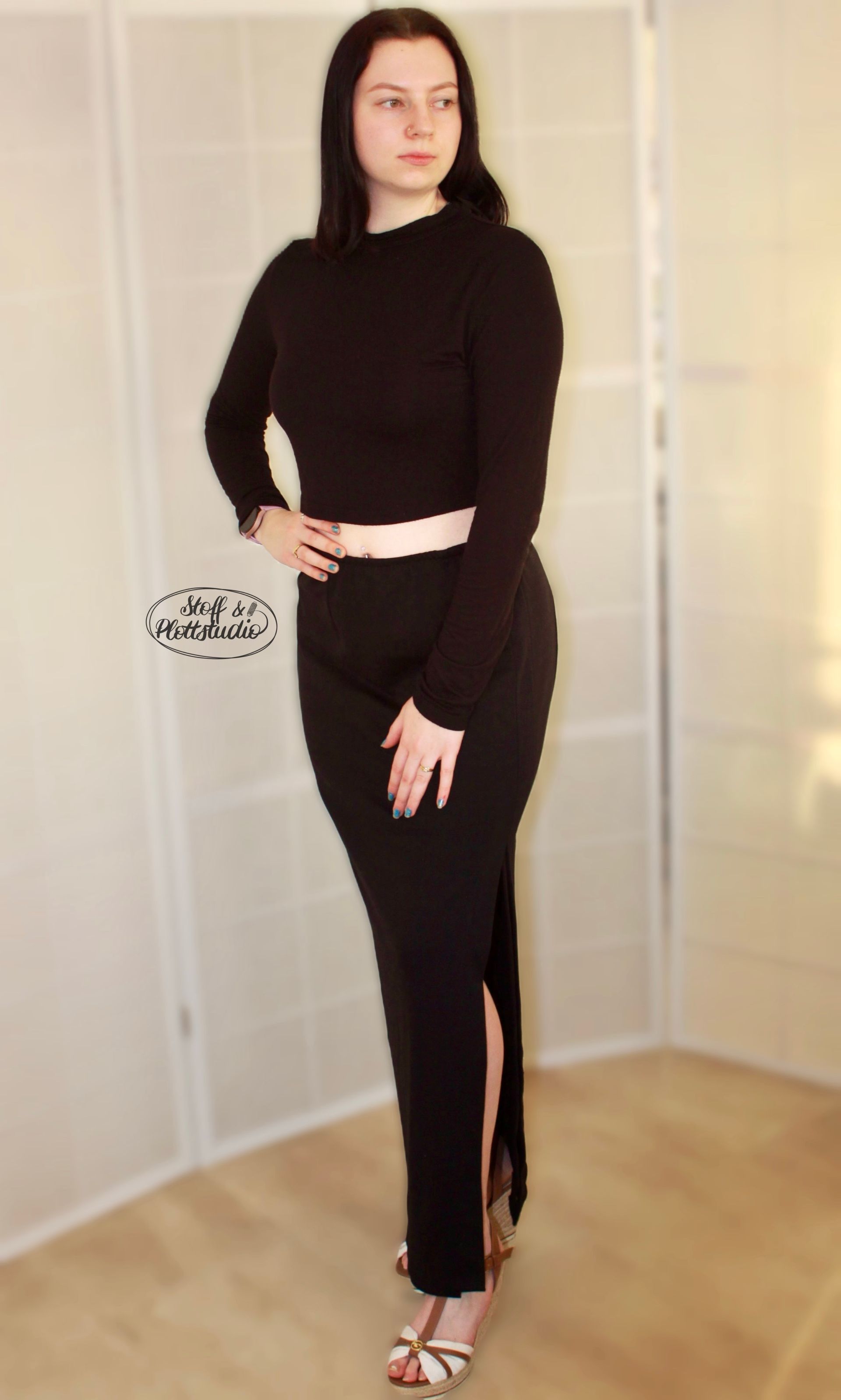 Nachdem in der letzten Einheit ein Kleid genäht wurde, steht nun auch schon wieder das nächste Set an. Beginnen werden wir mit einem langen Jerseyrock, welcher asymmetrisch im vorderen Bereich einen Schlitz enthält. Ich habe mich hier klassisch für schwarz entschieden und einen Punta di Roma verwendet. Da der Rock mit Futter genäht wird, kann noch ein weiterer Jerseystoff, welcher leichter ist, als Futter gewählt werden. Ich habe mich allerdings dafür entschieden, für Außenstoff und Futter den selben Stoff zu verwenden. Das Schöne an dem Schnitt ist, dass Außenstoff und Futter gleich gearbeitet werden. Man näht somit zweimal den gleichen Rock.